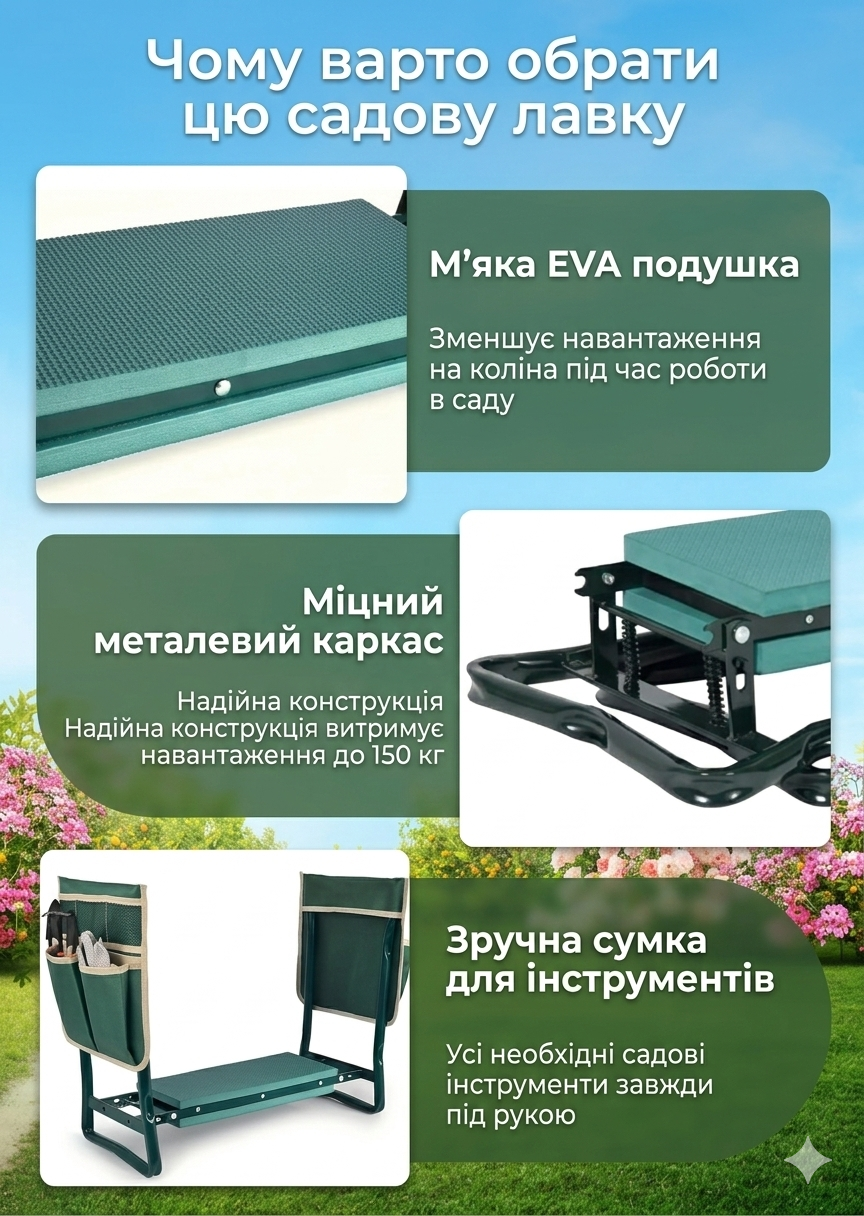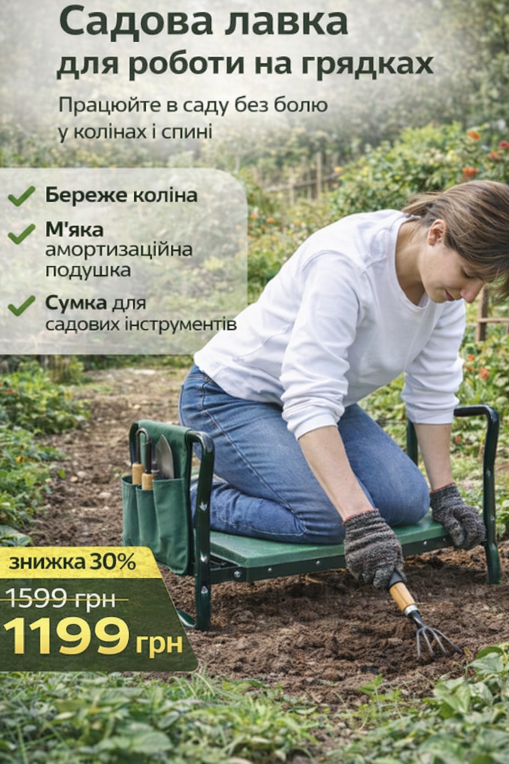 Садова лавка дозволяє працювати в саду комфортно без навантаження на спину та коліна